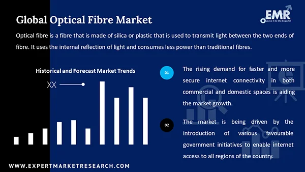 The indispensable demand for optical fibres in the 5G network is aiding the market growth. 5G, which is crucial in future technology, can provide enhanced mobile networks and ultra-reliable low-latency communications, which uses fibre optics to transmit signals. This is expected to aid the market growth. Technological advancements and innovations, along with the rising demand for faster and more efficient networks, are leading to the development of superior optical fibres. Latest communication trends such as all-optical networks, which allow data transmission without electric procession resulting in farther transmission distance, are expected to bolster the market growth. Moreover, the development of advanced technologies such as orbital angular momentum (OAM), which has the potential to increase transmission speed by 100 times, is also anticipated to provide further impetus to the market growth.