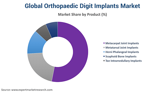Various products in the market include metatarsal joint implants, metacarpal joint implants, toe intramedullary digit implants, scaphoid bone digit implants, and hemi phalangeal digit implants.