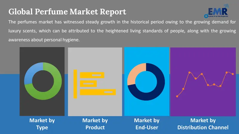 The key trends in the perfume market include the growing research and development activities by the market players to innovate fragrances and enhance the quality of packaging, thriving e-commerce sector, and rising investment towards social media marketing.