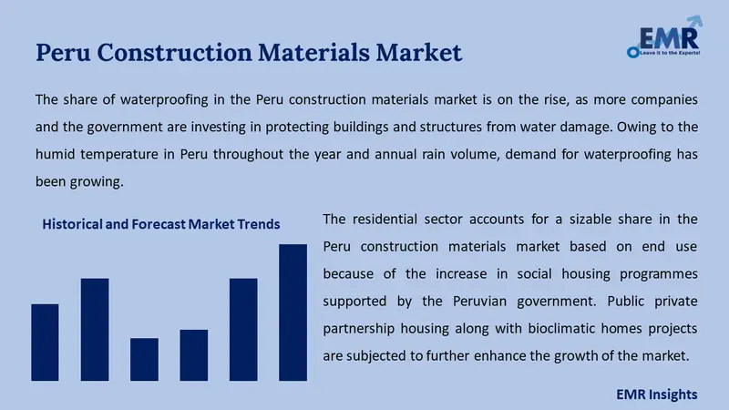 The residential sector accounts for a sizable share in the Peru construction materials market based on end use because of the increase in social housing programmes supported by the Peruvian government. Public private partnership housing along with bioclimatic homes projects are subjected to further enhance the growth of the market.