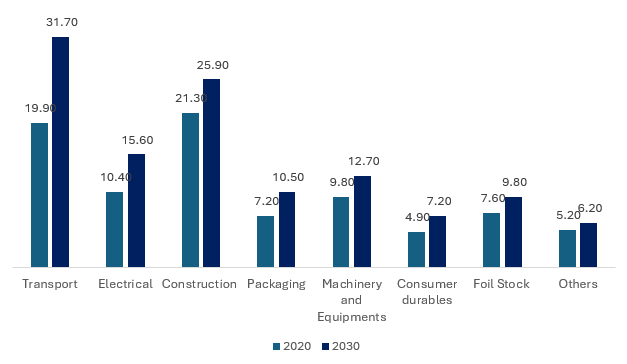 Figure: Aluminium semi-finished products consumption, 2020 vs 2030, MMT