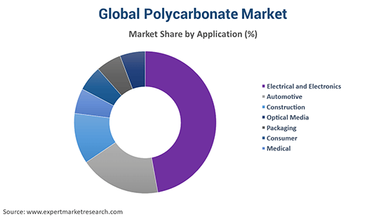 Electrical and electronics, automotive, construction, optical media, packaging, consumer, and medical are the leading applications of polycarbonate in the market.