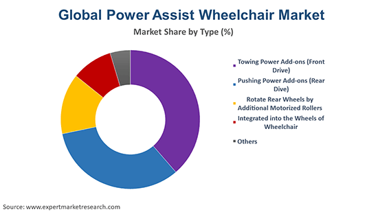 The types of power assist wheelchairs include towing power add-ons (front drive), pushing power add-ons (rear drive), rotate rear wheels by additional motorised rollers, integrated into the wheels of wheelchair, among others.