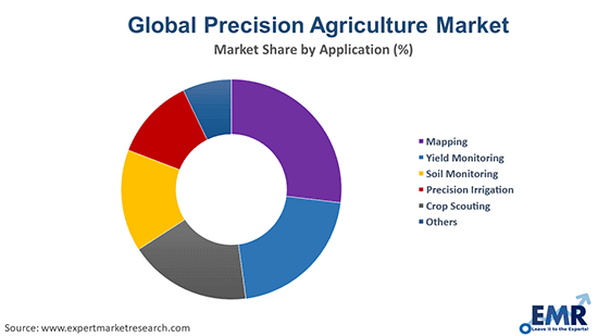 The significant offering considered in the market report are mapping, crop scouting, yield monitoring, soil monitoring, and precision irrigation, among others.