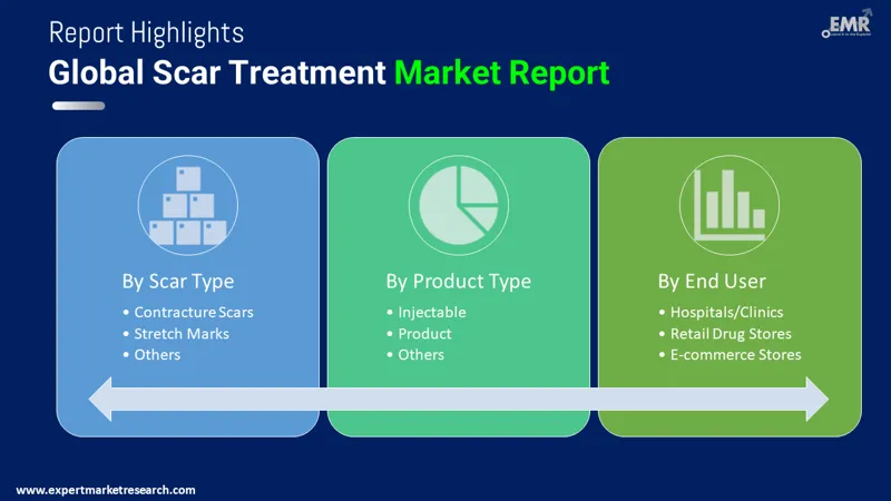 The market segmentation by treatment type includes atrophic scars, hypertrophic and keloid scars, contracture scars, and stretch marks. This market segment illustrates the different types of treatment types.