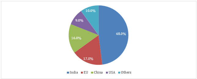 API Drug Master Files (DMF) are documents containing information on APIs that are submitted to the U.S. Food and Drug Administration (FDA) by API manufacturers to provide confidential and detailed information about their facilities and the processes used in the manufacturing, processing, packaging, and storing of human drug products. In 2023, India accounted for 48.0% of the global actives API DMFs followed by the EU with 17.0%.