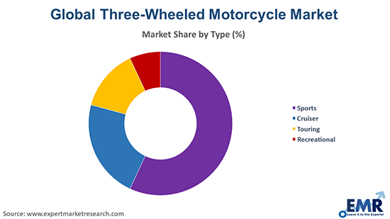 The market is categorised according to the type, which includes sports, cruiser, touring, and recreational.