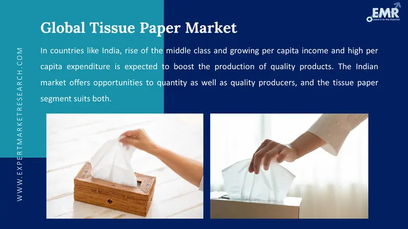 Consumers nowadays are putting more stress on cleanliness and health consciousness, which is turning out to be a major factor propelling the growth of tissue paper market. The demand for tissue products like wet wipes, toilet paper, and facial tissues surged as a result of the COVID-19 pandemic's increased emphasis on hygiene. Consumers' emphasis on cleanliness and personal hygiene in both homes and public areas is predicted to fuel market expansion going forward, particularly in areas with growing middle-class populations.
