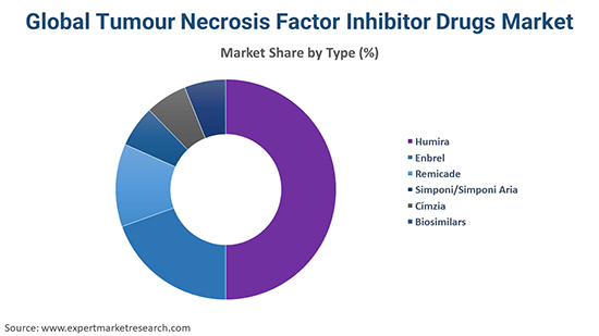 The leading types of tumour necrosis factor inhibitor drugs in the industry are Humira, Enbrel, Remicade, Simponi/Simponi Aria, Cimzia, and biosimilars.