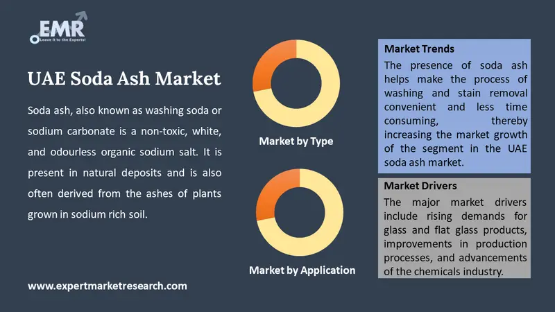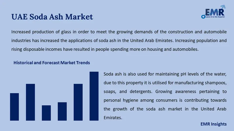 The various applications of soda ash in the UAE are glass, chemicals, soaps and detergents, metallurgy, and pulp and paper, among others.