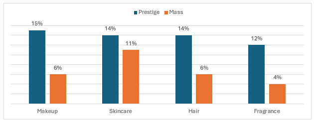 Figure: Y-o-Y % Change Based on Sales Revenue in U.S. Beauty and Personal Care Sector by Category, 2023