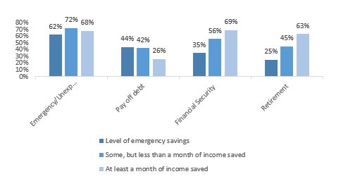 The Consumer Financial Protection Bureau reported that 35% of people who don't have emergency savings see financial security as vital for saving, while 69% of those with at least one month's worth of emergency funds prioritize financial security.