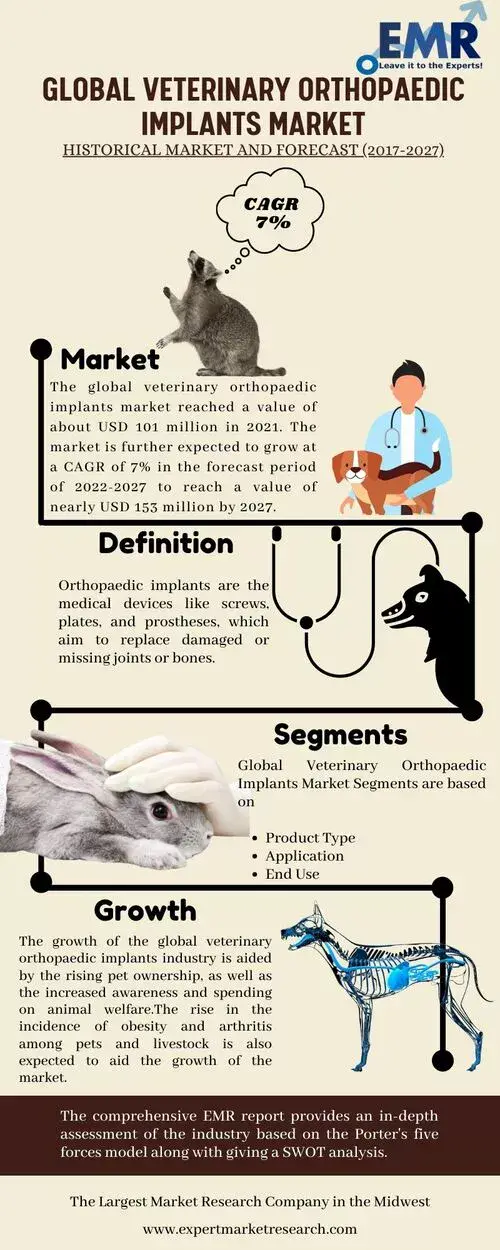 Orthopaedic implants are the medical devices like screws, plates, and prostheses, which aim to replace damaged or missing joints or bones. The scope of veterinary orthopaedic implants is increasing rapidly as owners of livestock and pets are increasingly investing in medical care, including repairing and healing injuries to bones and joints caused by diseases or injuries.