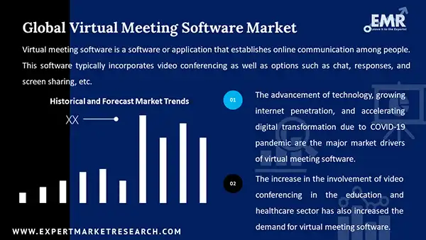 The usage of virtual meeting software among corporate and government organisations has increased in recent years, along with the number of virtual meeting software providers around the world. The market has been boosted by a significant increase in productivity witnessed in work-from-home workers, which led to the allowance of remote work in many firms by 2019. Further, the increased adoption of technologies, such as facial recognition, better compatibility ad security, has a beneficial impact on the growth of the virtual meeting software industry. Moreover, the integration of technology, such as artificial intelligence and cloud-based technology, is expected to provide lucrative prospects for worldwide market advancement.