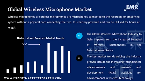 The key market trends guiding the market growth include increasing technological advancements, lowering costs of wireless microphones, and research and development (R&D) activities for advancements in wireless technology.